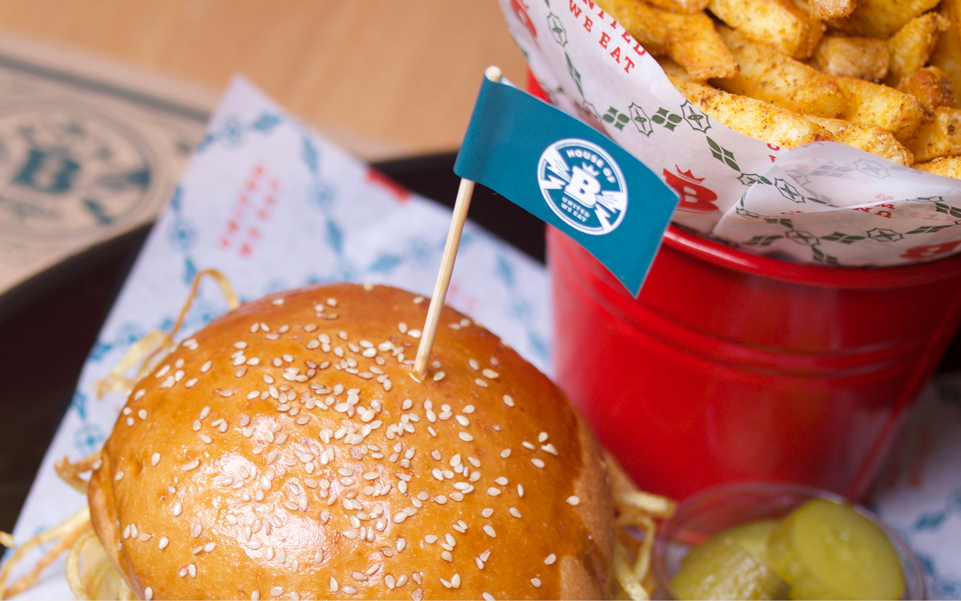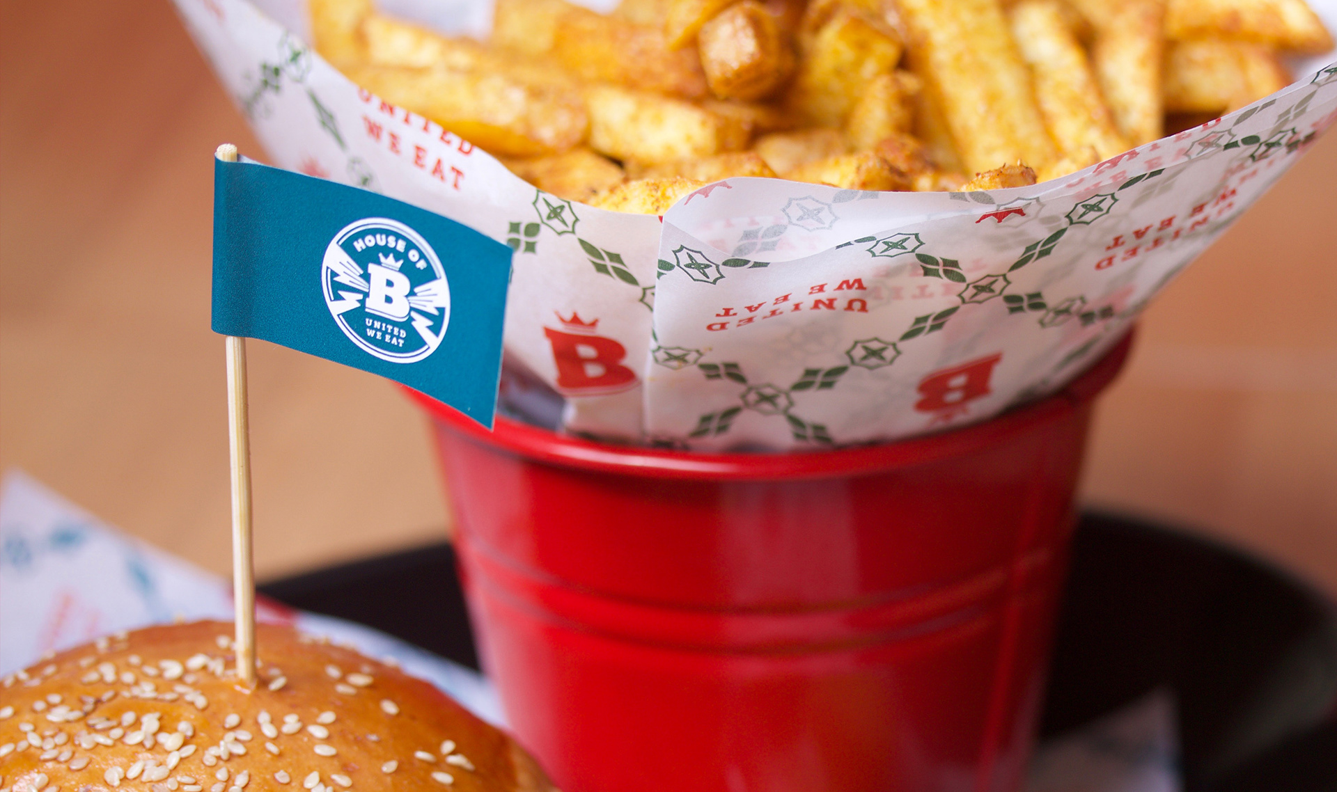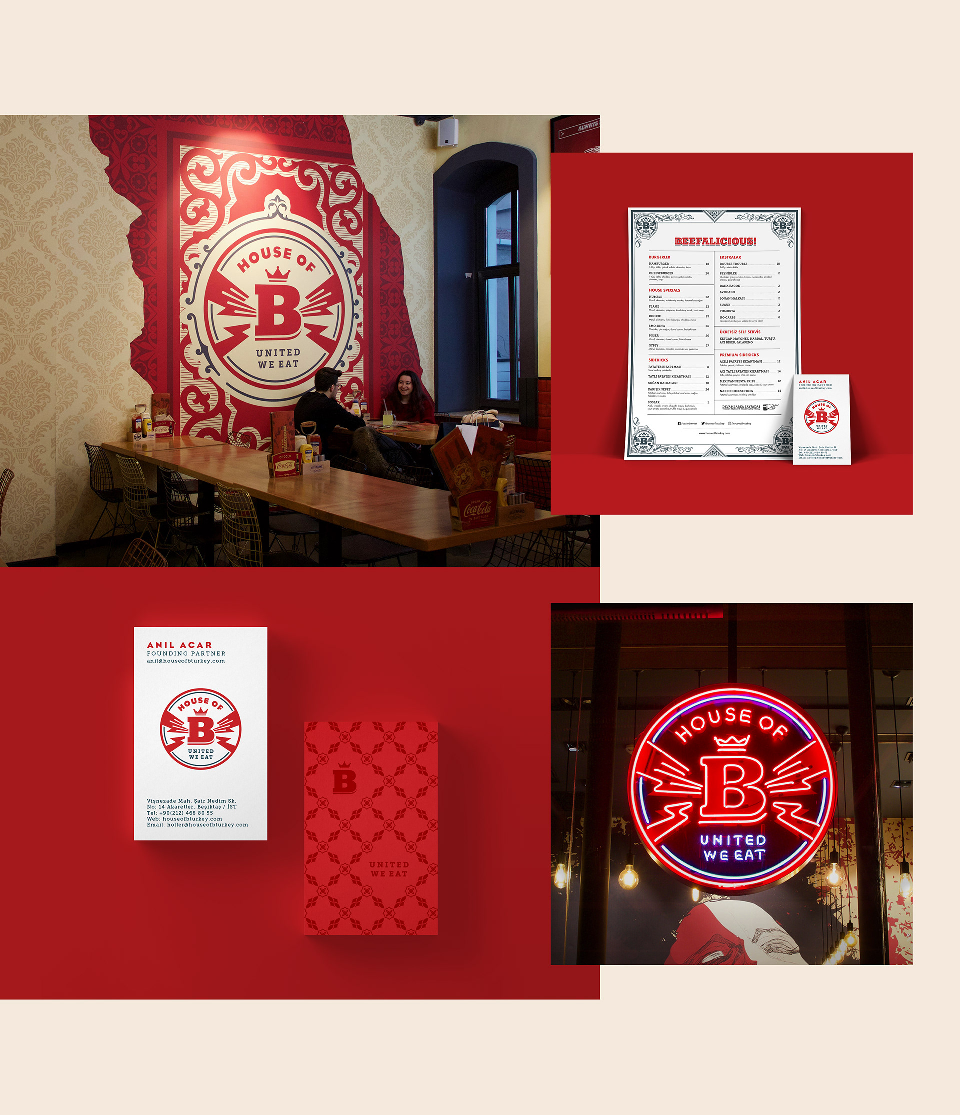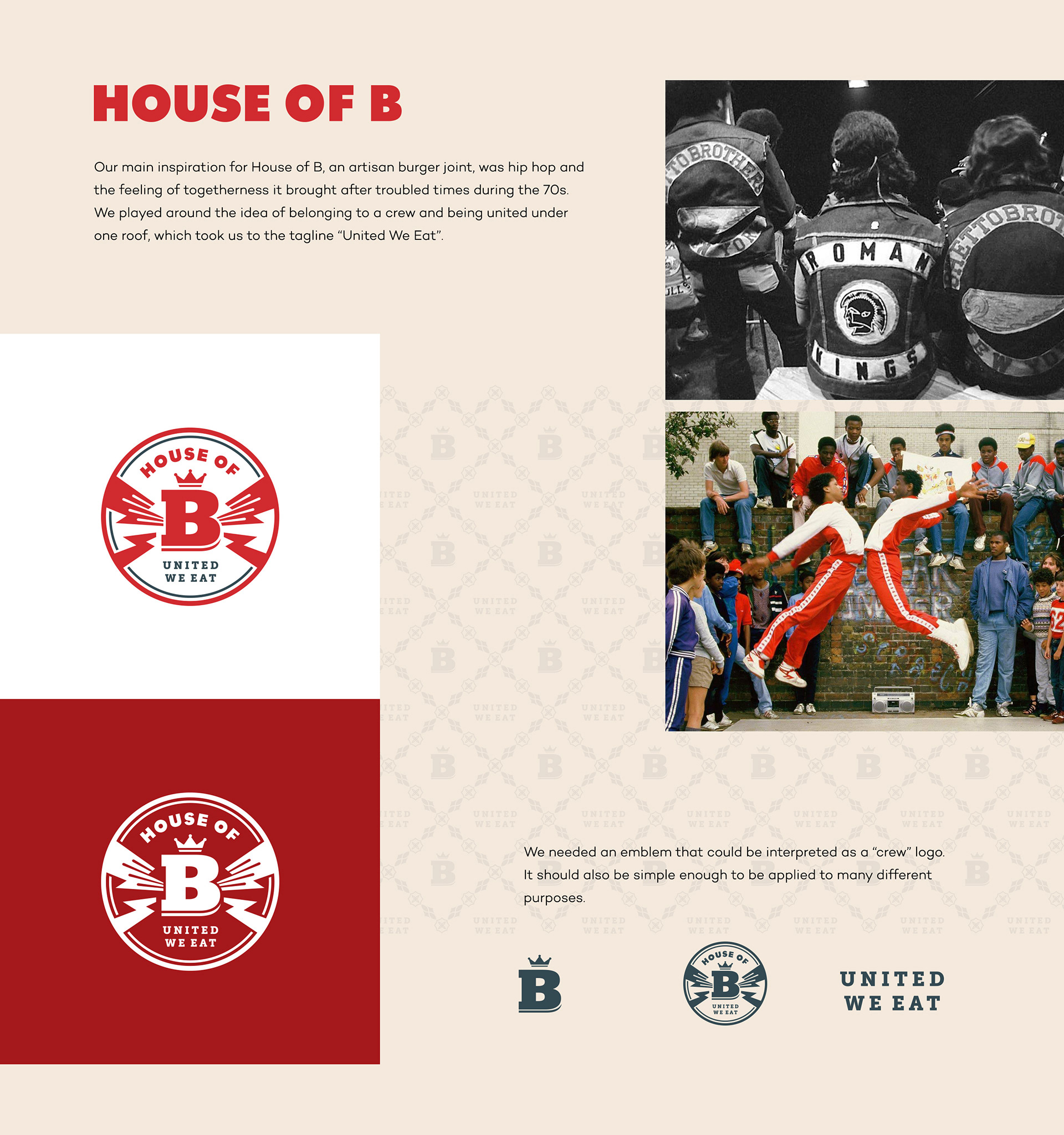 Our main inspiration was hip hop and the feeling of togetherness it brought after troubled times during the 70s. We played around the idea of belonging to a crew and being united under one roof, which took us to the tagline “United We Eat”. We needed an emblem that could be interpreted as a “crew” logo. It should also be simple enough to be applied to many different purposes.