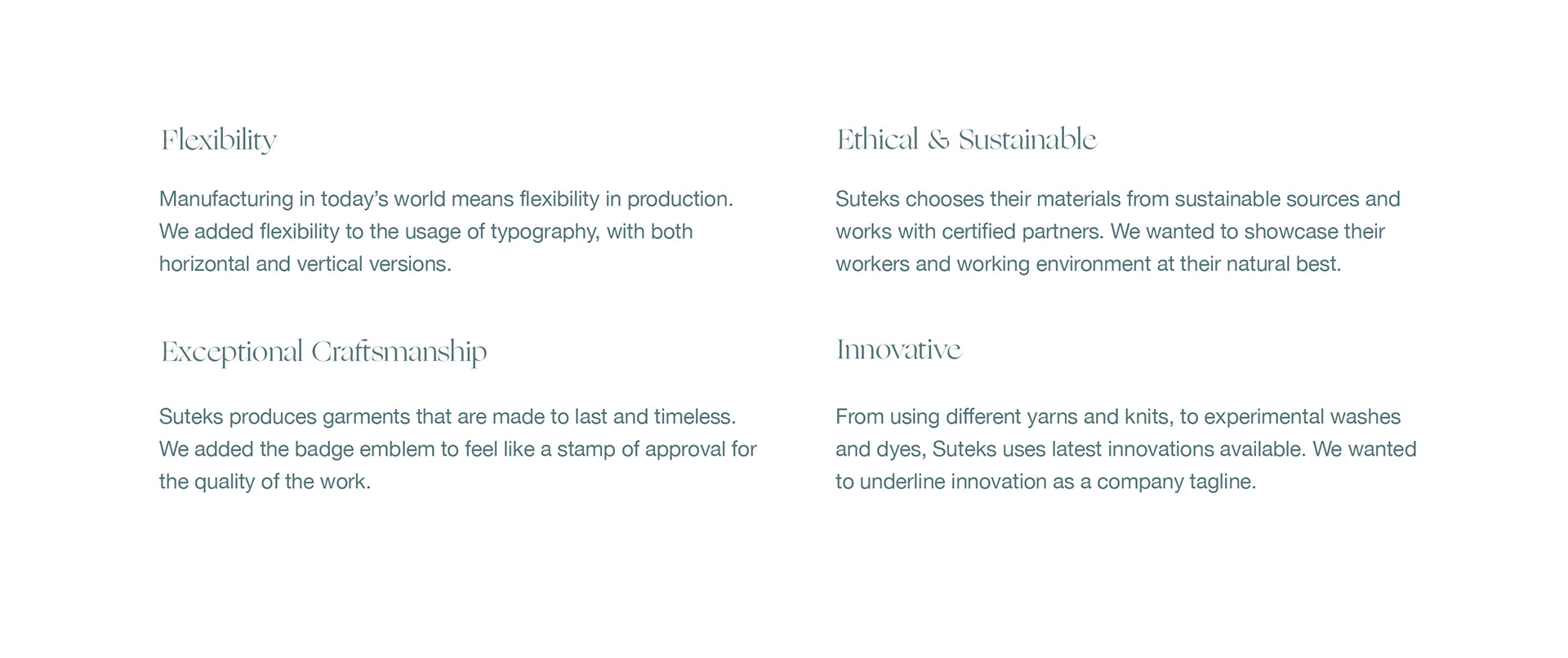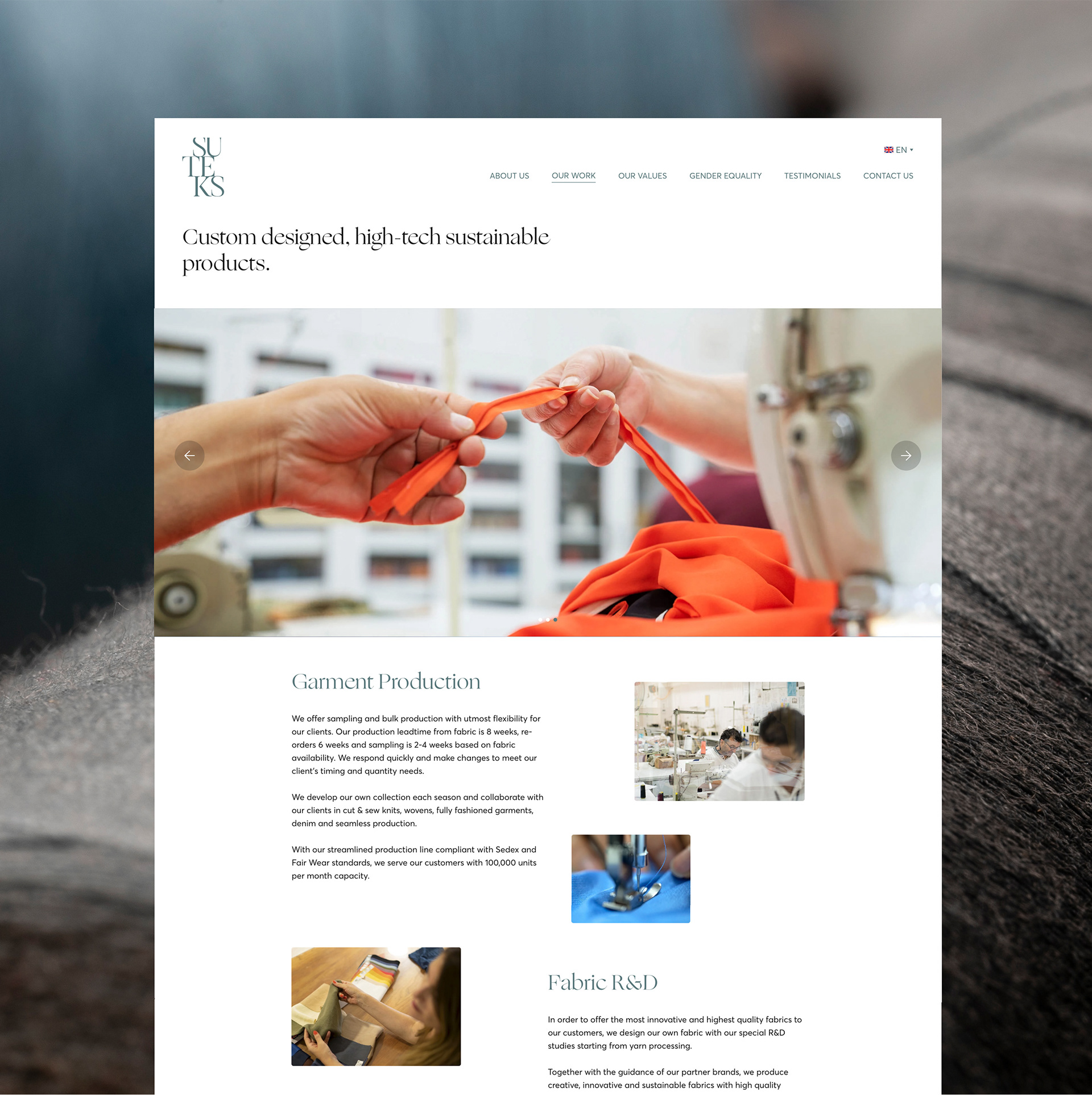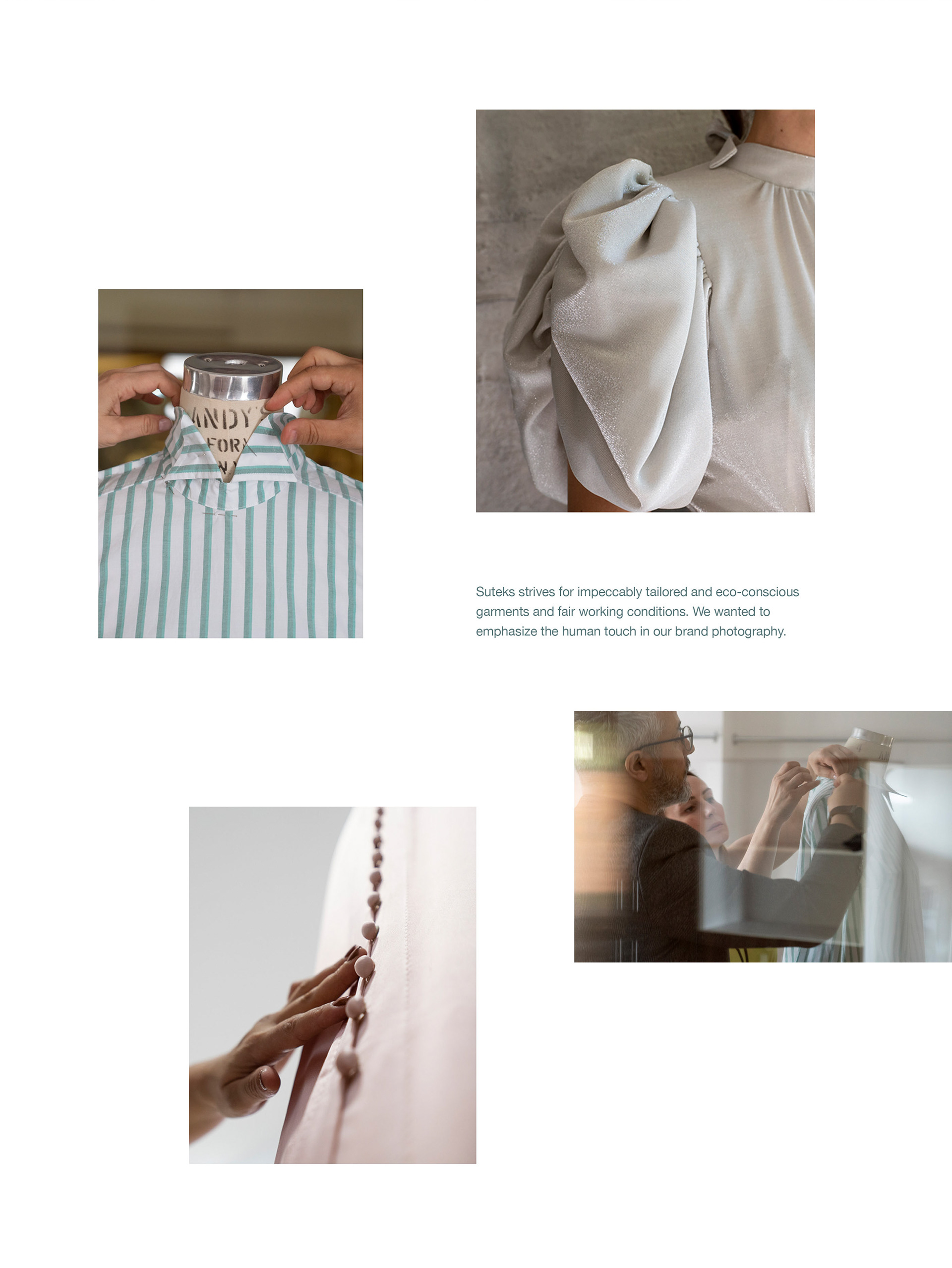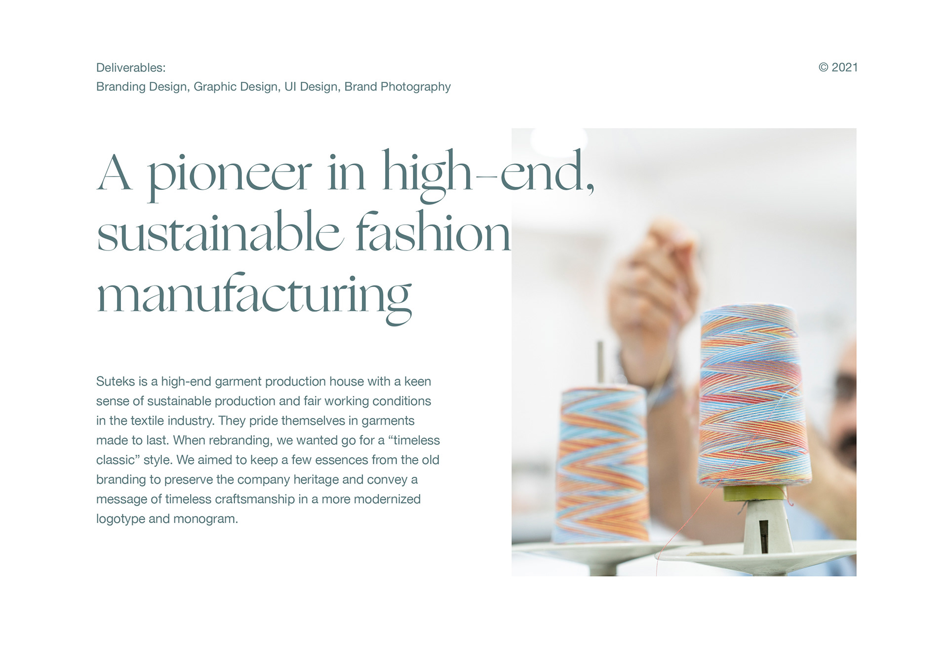Suteks is a high-end garment production house with a keen sense of sustainable production and fair working conditions. They pride themselves in garments made to last. When rebranding, we wanted go for a “timeless classic” style. We aimed to keep a few essences from the old branding to preserve the company heritage and convey a message of timeless craftsmanship in a more modernized logotype and monogram. We also made a company photoshoot to emphasize the human touch both in terms of craftsmanship and workplace positivity.